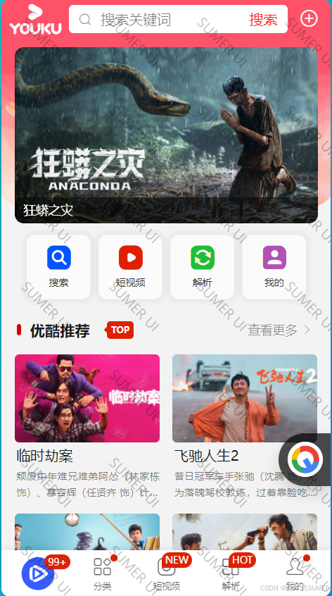 基于uniapp前端框架的精仿优酷视频UI界面,使用sumer ui组件库,首页/筛选/分类/搜索/影视详情/视频播放/短视频,支持影视列表,影视播放,短视频等,界面漂亮颜值高,视频直播抖音等